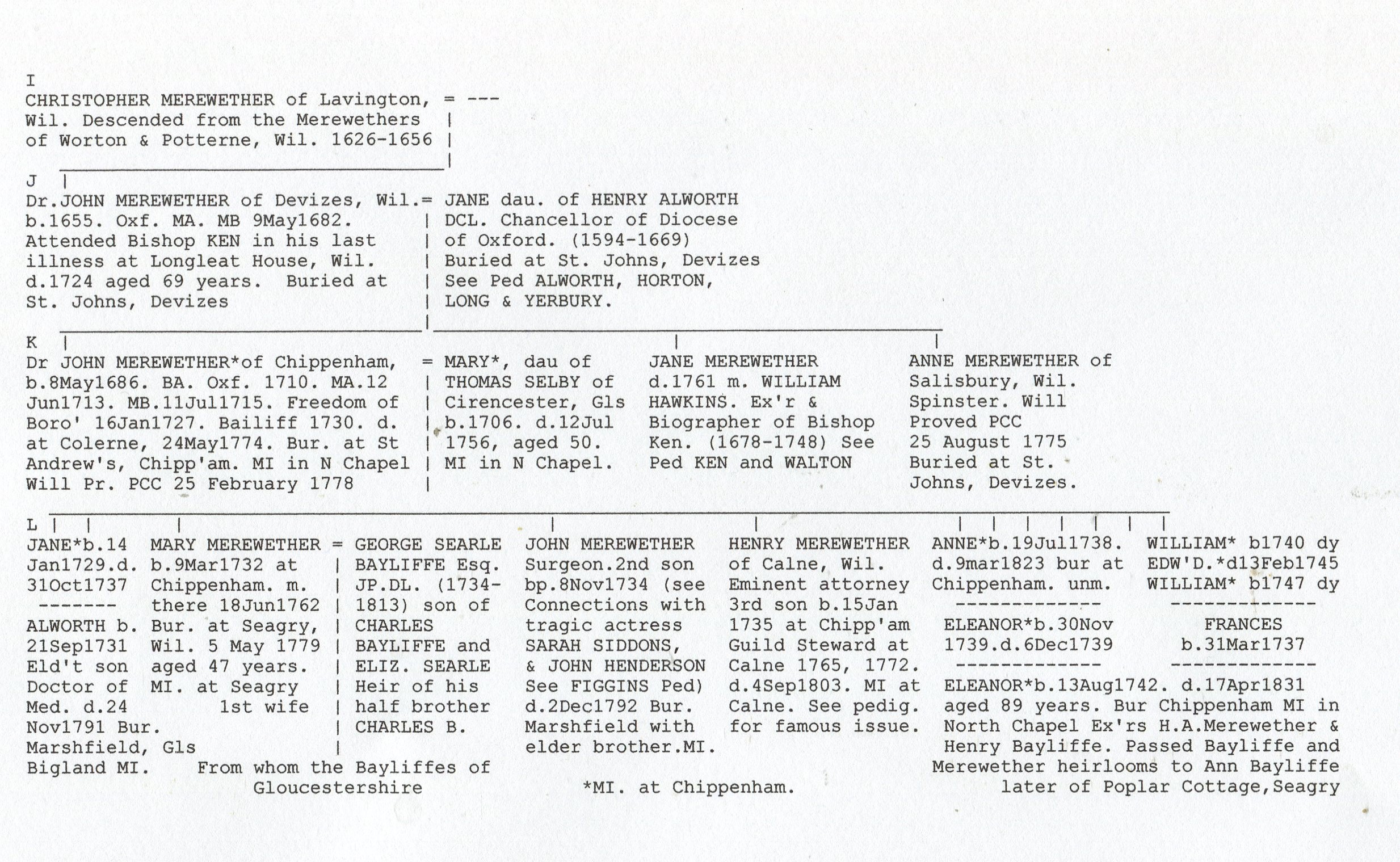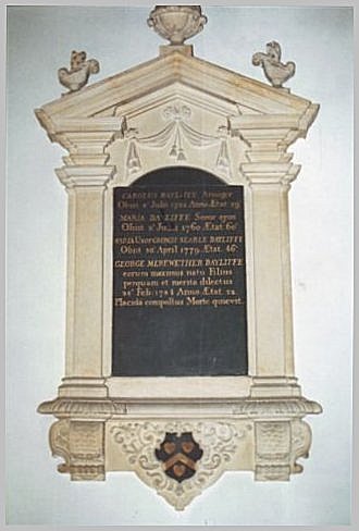 We continue the story with the children of George Searle Bayliffe and Mary Merewether. Two boys and three girls were born between 1762 and 1775 and the blight on the family succession caused by premature death due to the smallpox and influenza epidemics of the time seemed to have lifted. However any optimism was shattered by the death of his wife Mary who was buried at Seagry 5 May 1779 aged 47 years. Her epitaph in Latin appears on the memorial tablet on the north wall of the nave. She made no Will of course, and it was left to the eldest daughter Mary Susanna then 15 years of age, to help with the upbringing of her sisters Ann and Lucy who were 14 and 10 years old respectively. The elder son, George Merewether Bayliffe was an attorney in Chippenham when he died 4 years after his mother, aged 22 years. He died unmarried at Kingsdown near Bristol and was taken for burial at Seagry 9 February 1784. His name joined those of his grandfather Charles, great-aunt Mary and his mother on the memorial in the nave; 'Placida compostus morte quievit'.13
