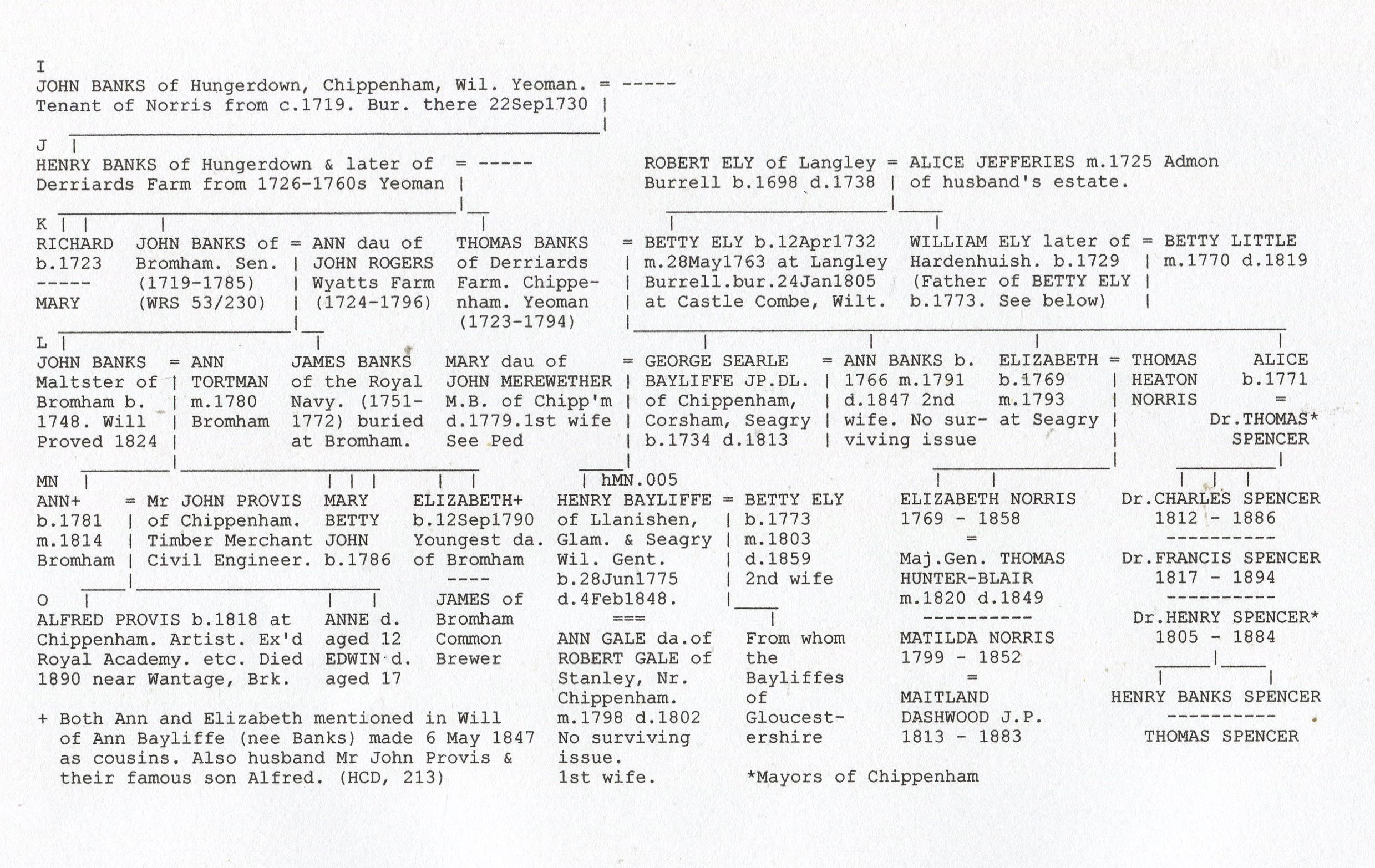 This branch of the family of Banks had been established in Bromham and Chippenham since the 16th century. In particular they were associated with the wealthy landowning family of Norris of Nonsuch House, Bromham. In 1710 William Norris of Lincoln's Inn, bought the Manor of Chippenham, Sheldon, and Lowden, and about 1718 John Banks first appeared as tenant of Derriads Farm. His son Henry took over the tenancy in 1725 and in 1728 a survey of the Norris Estate was made when John Norris, son of William, owned the Manor19. Out of a total Norris holding of 978 acres, Derriads was 117 acres, and a later undated rent-roll20 circa 1750 shows Henry with Derriads Farm, Hungerdown, and other lands, making a total around 200 acres.