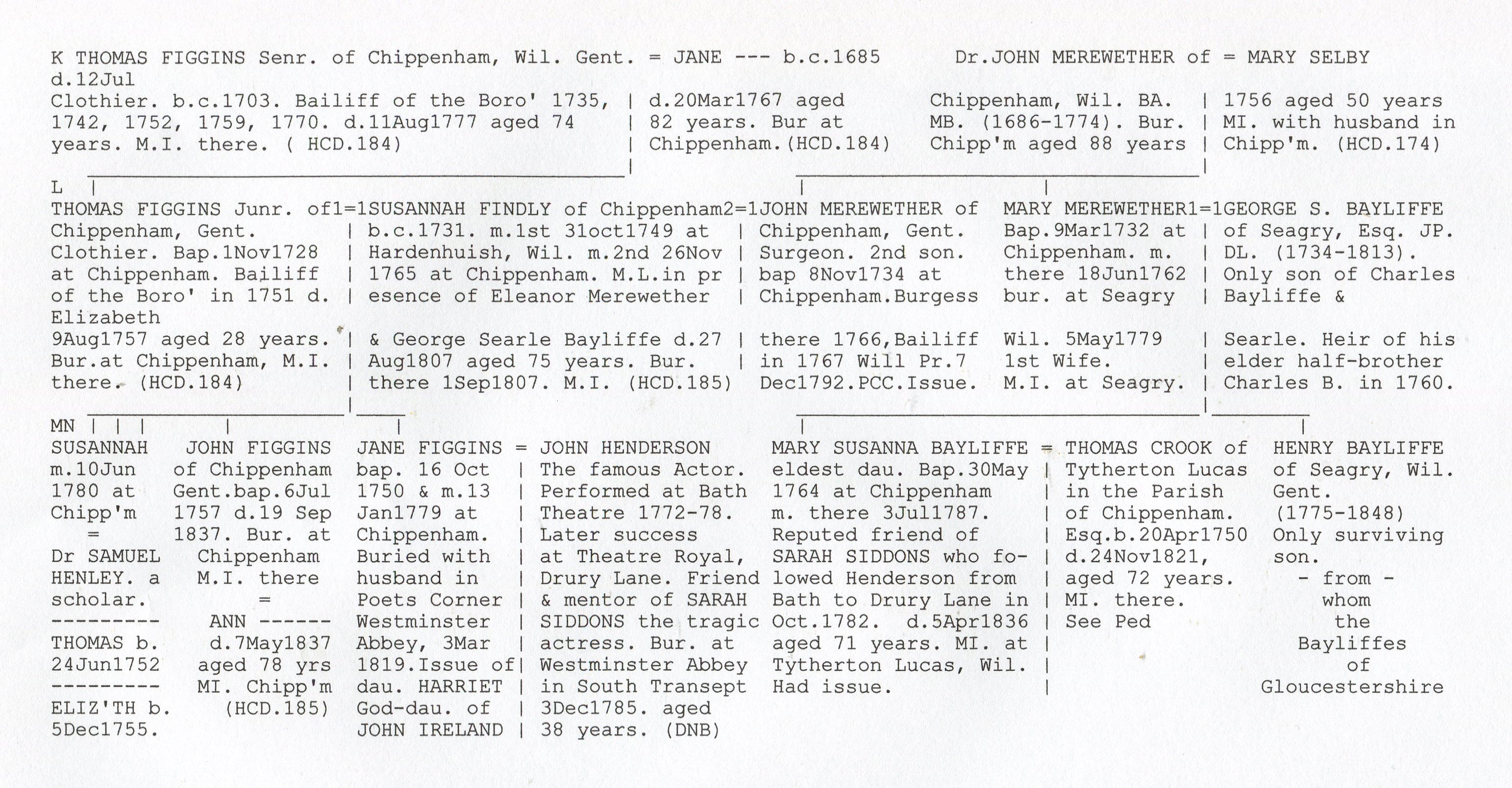 Mary Susanna Bayliffe the eldest daughter, baptised 30 May 1764 at St Andrew's Church, Chippenham married Thomas Crook of Tytherton Lucas, Wilts., Esq., 3 July 1787 at the Church of St. Bartholemew, Corsham, Wilts. By this time her father a widower of some 8 years, had moved to Pickwick House, Pickwick, Corsham, Wilts. This was quite a society wedding, meriting an entry in the 'Marriages of Eminent Persons' section of the Gentleman's Magazine. It is clear that her father George was courting the lady who was to become her stepmother some 4 years later. Several sources show that the children of the first marriage resented this development, which was to have profound consequences.