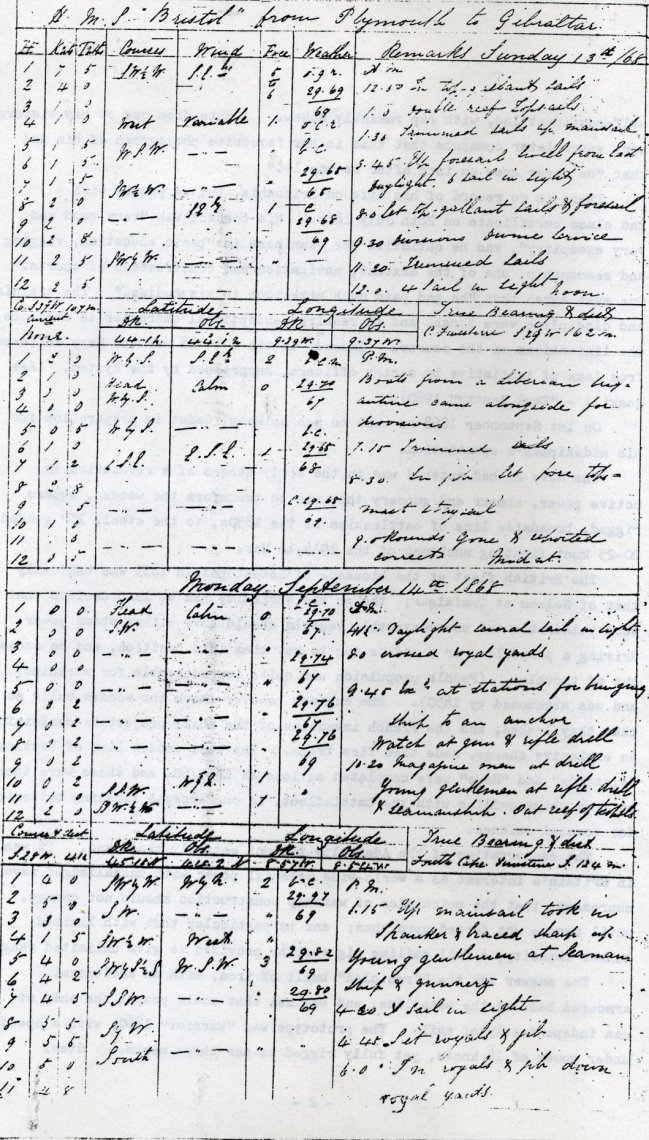Log of H.M.S. "Bristol" 13 / 14 September 1868.