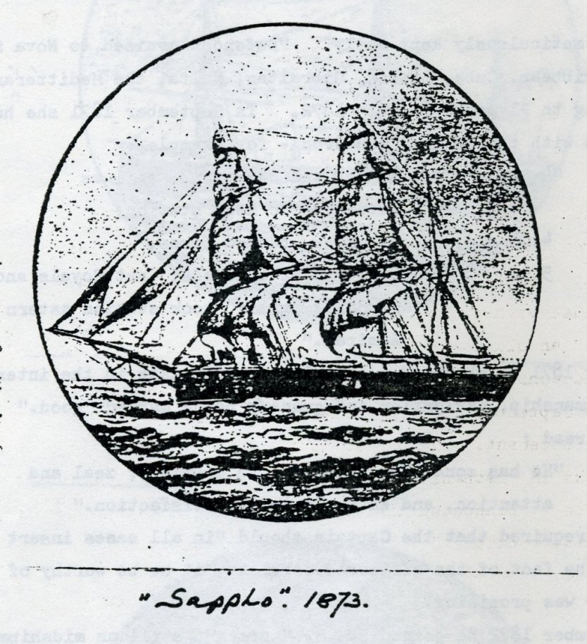 There is no record of "Sappho's" voyages. She was a sloop, built in 1873 of "composite" construction (wood and iron); 160 feet long and 940 tons displacement with 2 x 7" and 2 x 64 pounder guns. Her complement was 14 officers, 12 petty officers and 70-80 seamen. Life on board such a small ship must have been cramped in fine weather, and near intolerable in bad. Her Captain throughout was Commander Digby who reported on 13th April 1878:
