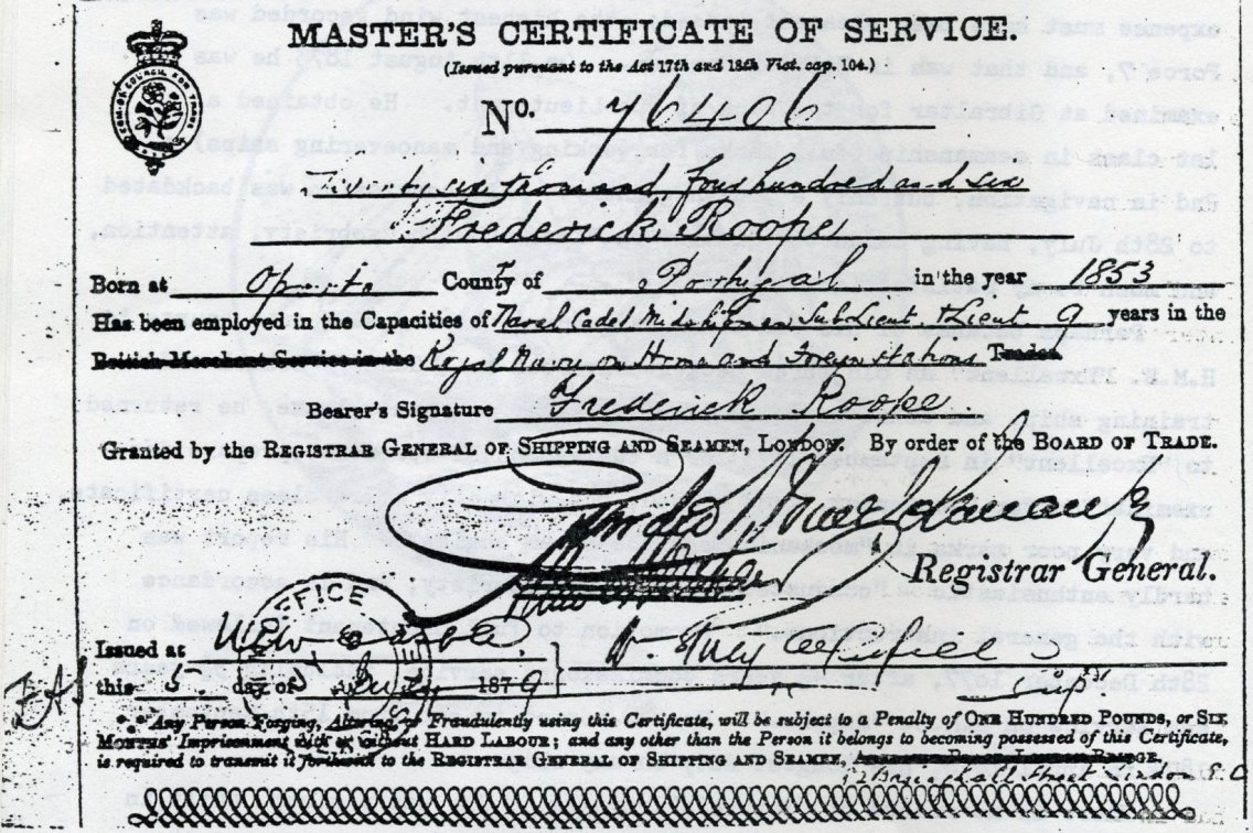 Frederick Roope was born in Oporto on 31st August 1853, the second son of Cabel and Elizabeth Frederick Maria Roope. The Roopes had been in the Port Wine trade for generations, and Cabel (1823-1880) was a partner in Hunt Roope Teage & Co. of Oporto and London. Their eldest son Cabel (1852-1912), the last of the line to follow the family business, was an eccentric bachelor of convivial habits and considerable business acumen who became a legend in Oporto in his lifetime and beyond. (see "Port" by R. Croft-Cooke).