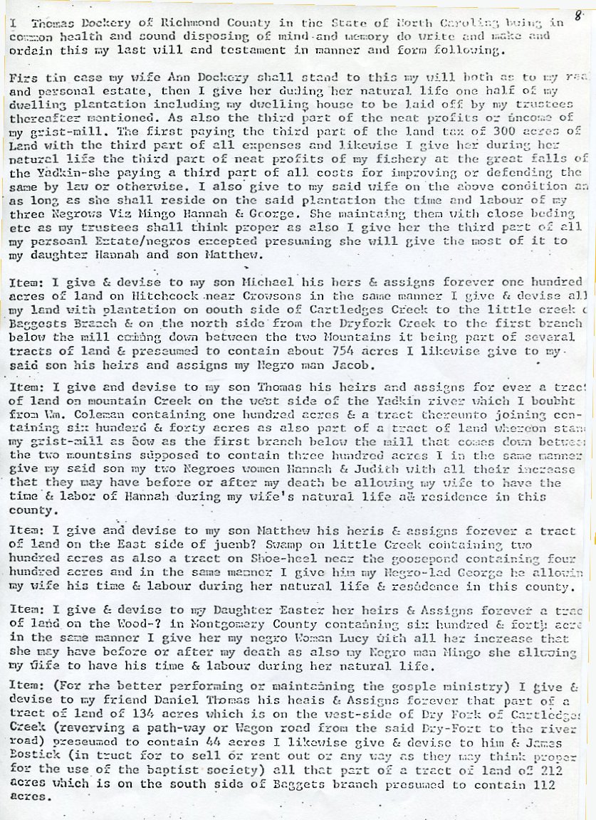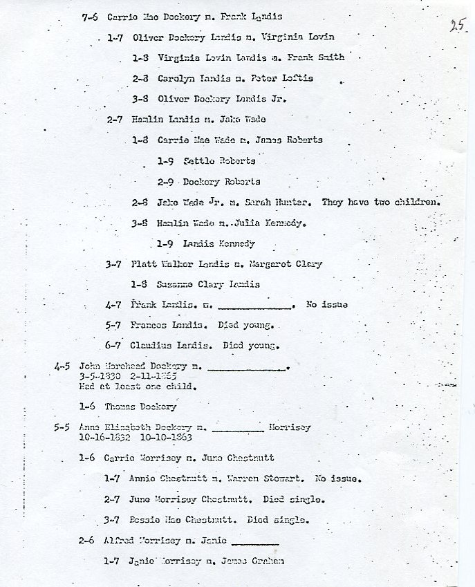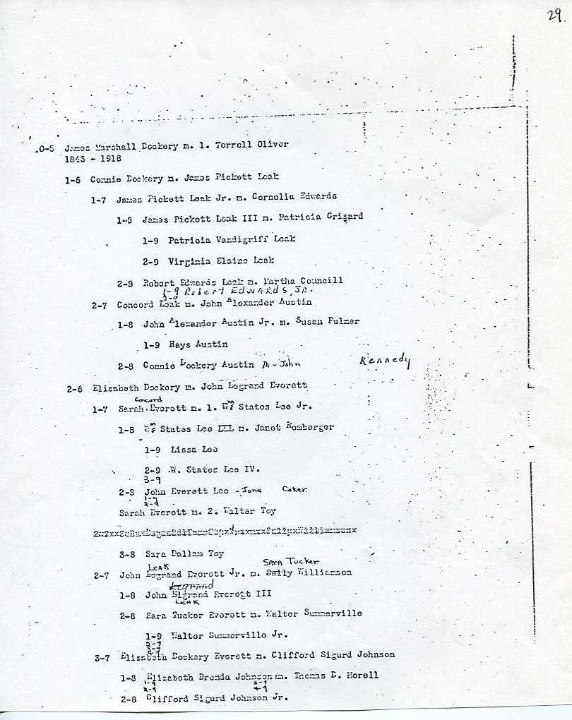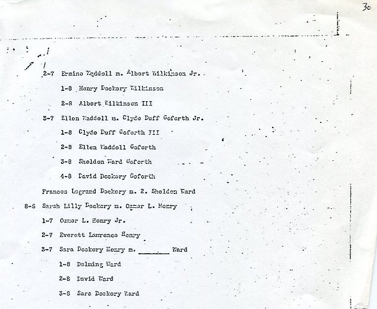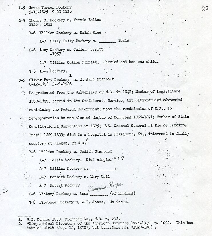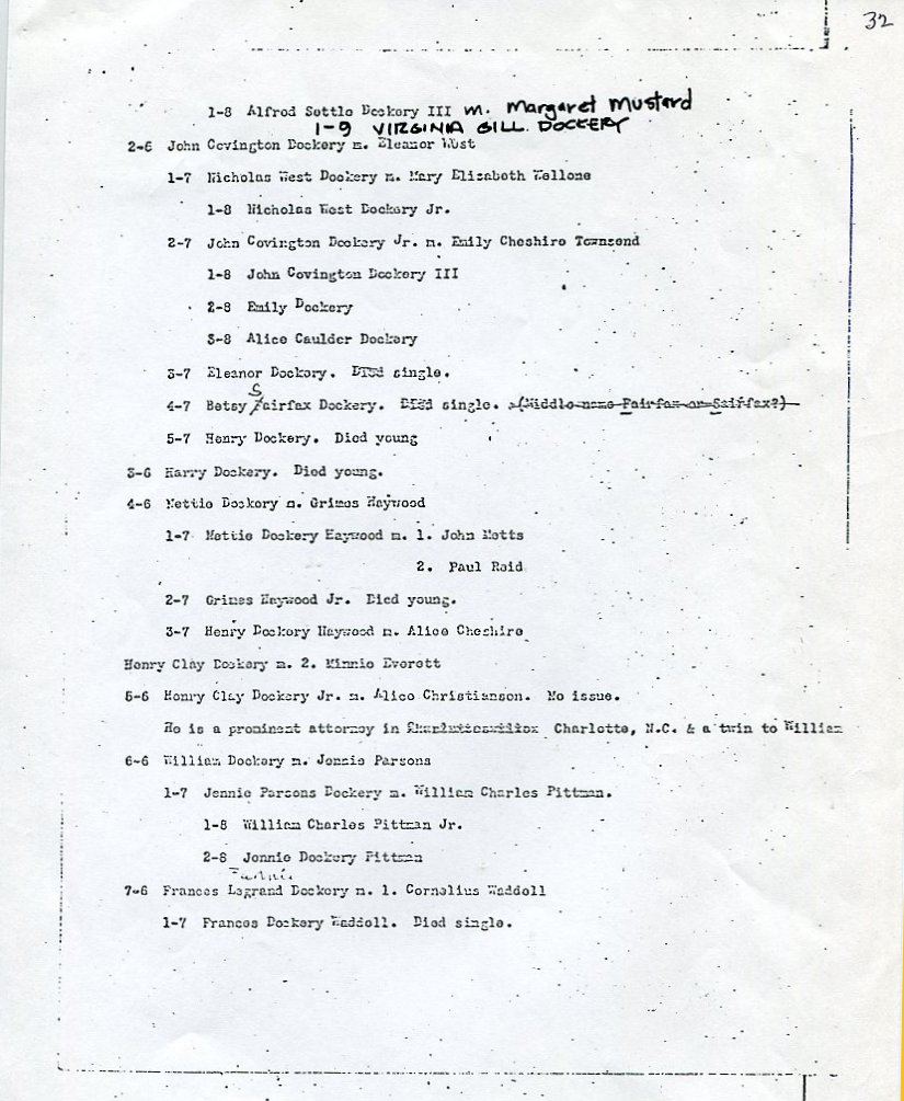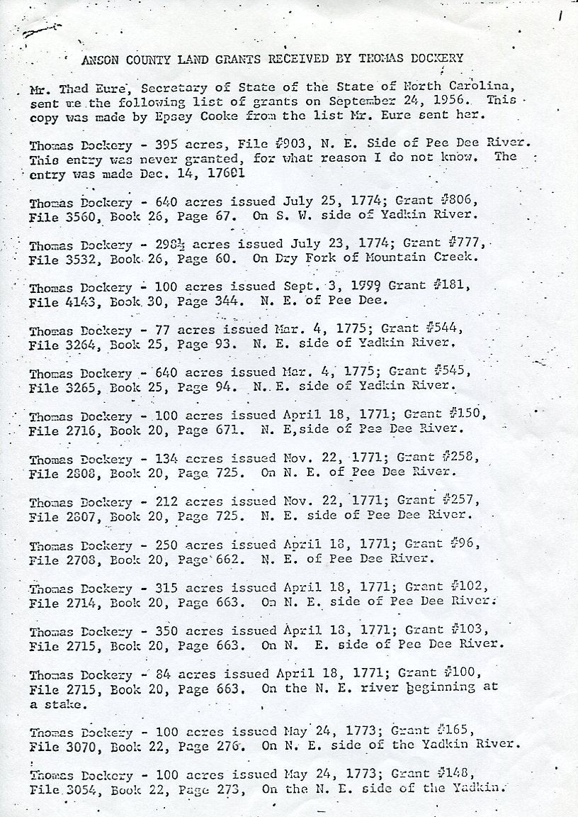 My father Bernard Frederick Rawes collected a mass of material on the Dockery family in the 1980s of which the following 31 numbered sheets is a small part. The sheets were probably numbered by my father and sheet six is either missing or numbered incorrectly. It is not now known where he acquired them, it is either from a member of the Dockery family or more likely a history society in North Carolina or Maryland.