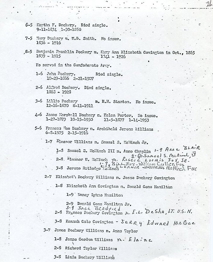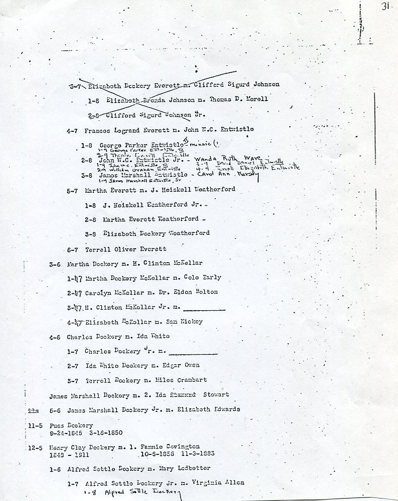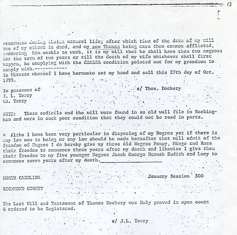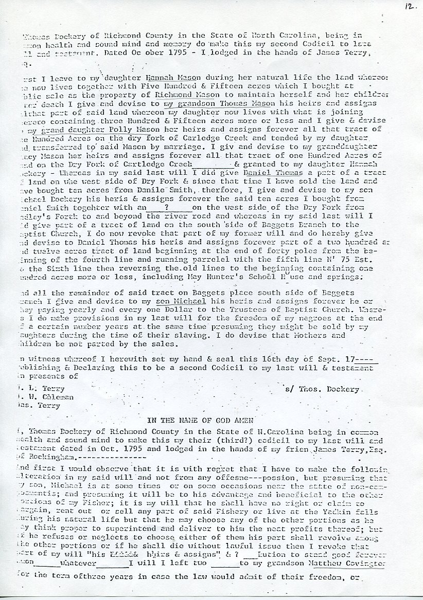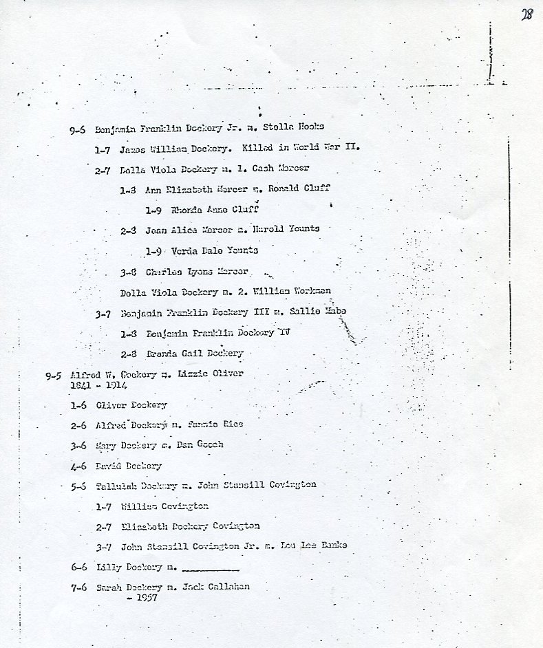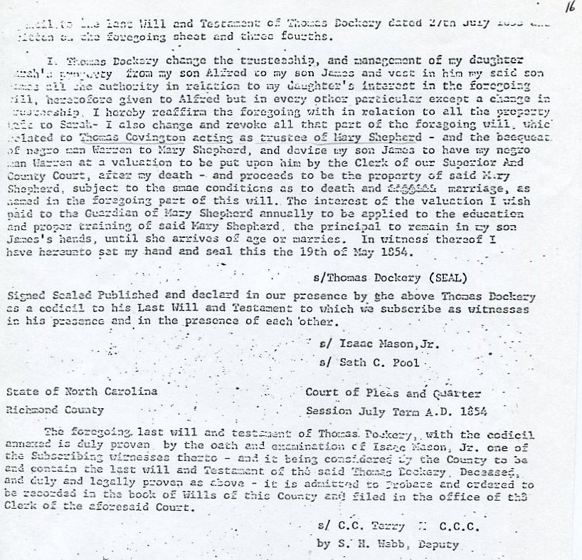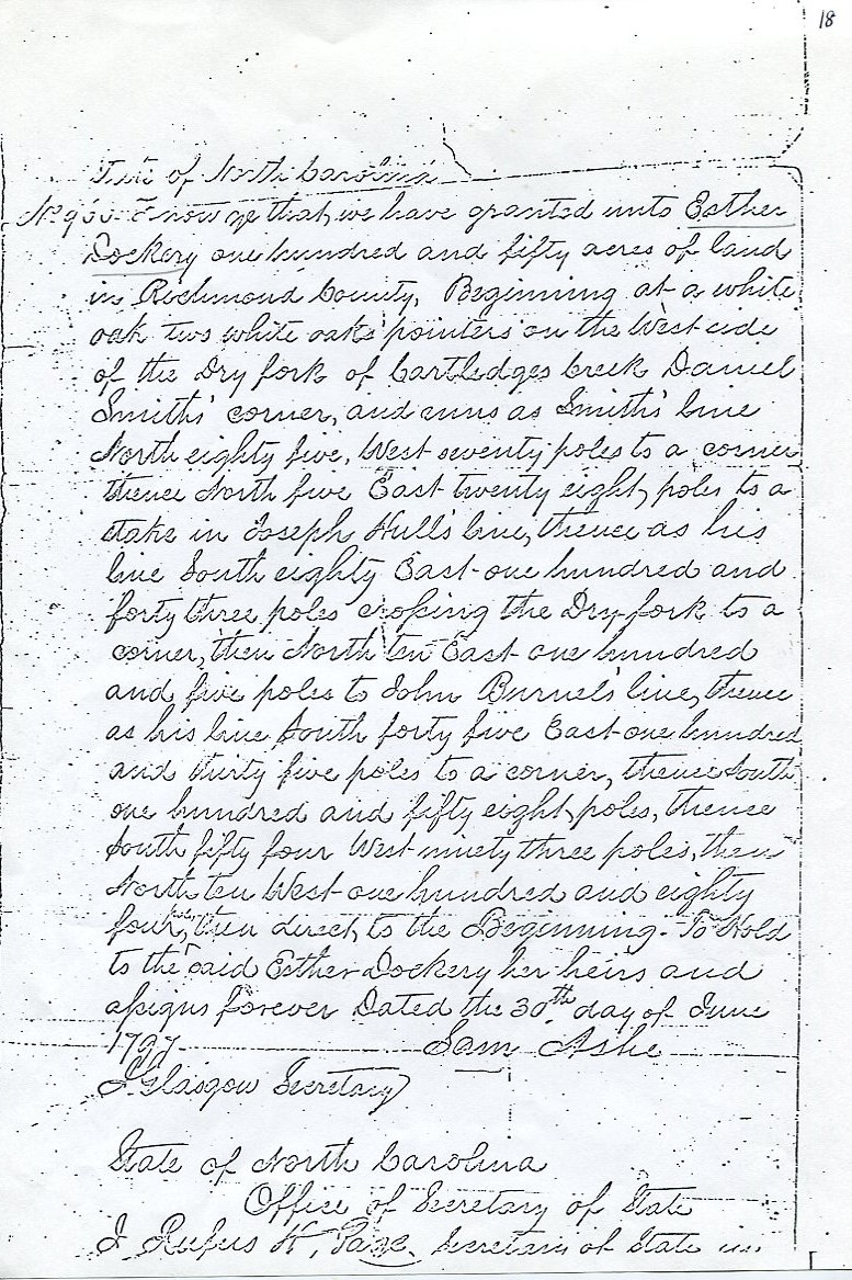 My father Bernard Frederick Rawes collected a mass of material on the Dockery family in the 1980s of which the following 31 numbered sheets is a small part. The sheets were probably numbered by my father and sheet six is either missing or numbered incorrectly. It is not now known where he acquired them, it is either from a member of the Dockery family or more likely a history society in North Carolina or Maryland.