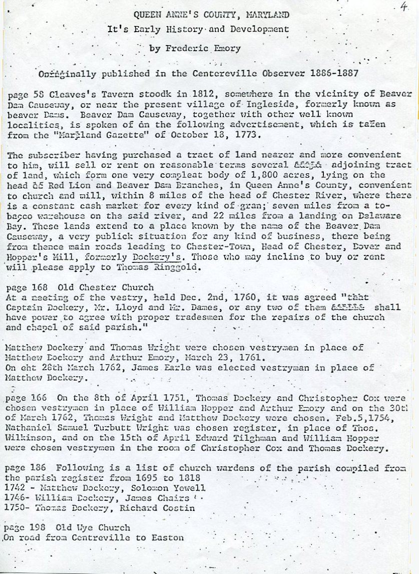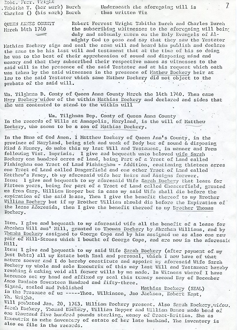 Within the material is a listing of Dockery Land Grants; the early development of Queen Anne's County, Maryland by Frederic Emery; the will of Matthew Dockery of Queen Anne's County; The will of Thomas Dockery of Richmond County; some letters; A line of descent from James and Kerenhappuch Turner.