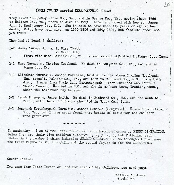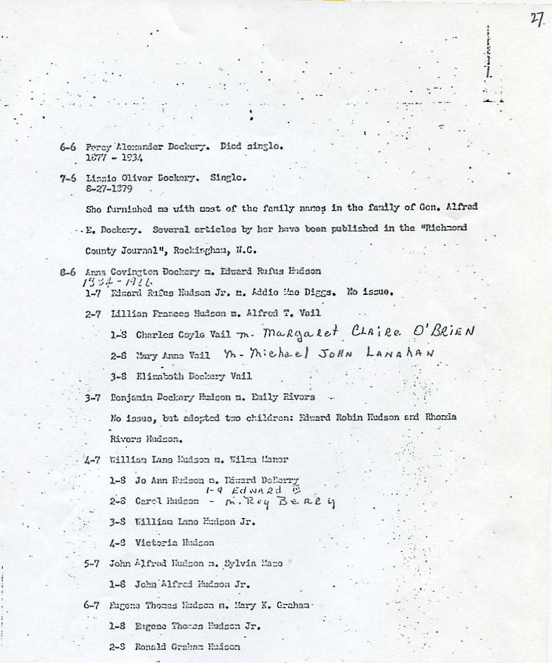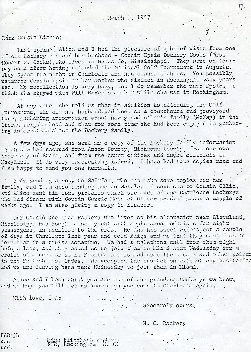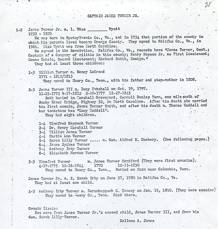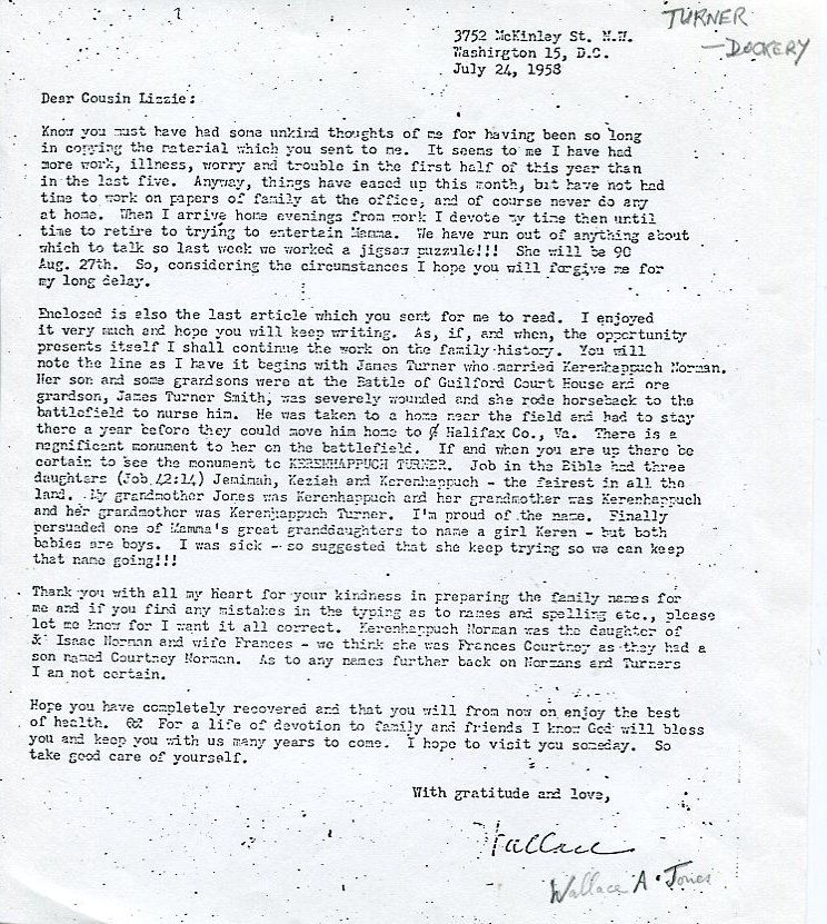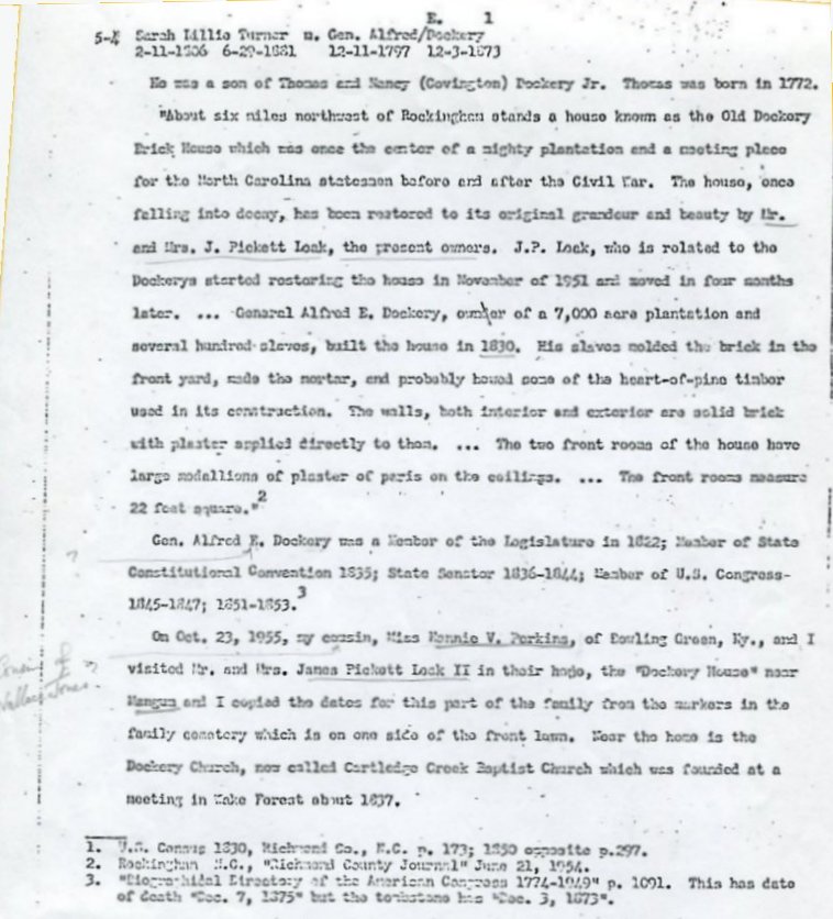 Judging by letters within the material it was probably gathered by Lizzie Dockery, my father's third cousin, who lived in Rockingham, North Carolina. Lizzie appears to have been gathering material from her cousin Henry Clay Dockery, of Charlotte, North Carolina, who died in 1965, and Wallace A Jones, of Washington, a more distant Turner cousin. Elizabeth Dockery 1879-1971, of Rockingham, was the daughter of Benjamin Franklin Dockery, brother of Henry Clay Dockery.