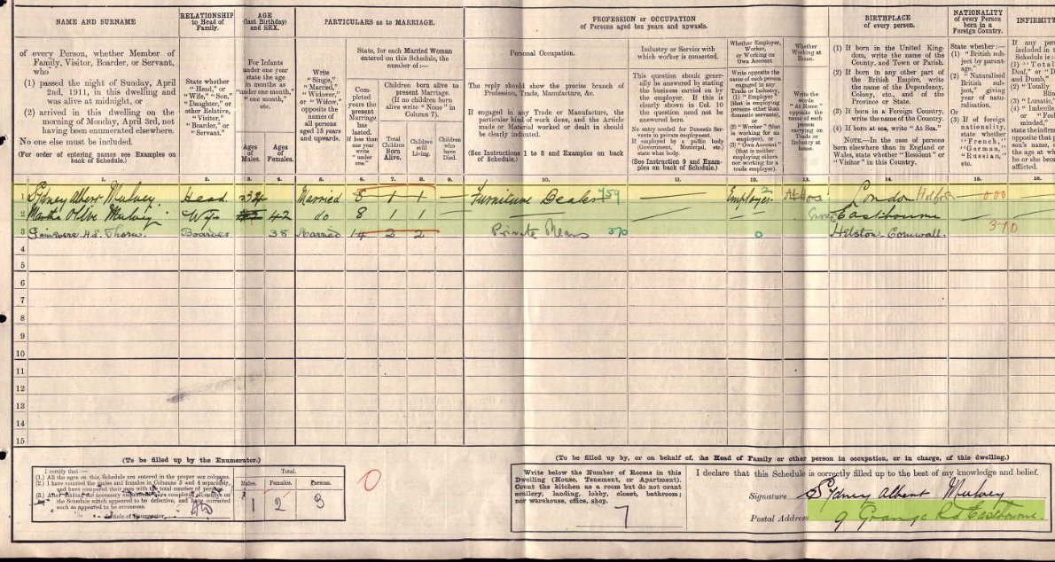 The 1910 Electoral Roll records that Sydney Albert Mulvey had moved to 9 Grange Road, Eastbourne, electoral rolls of this time only record the male voter.