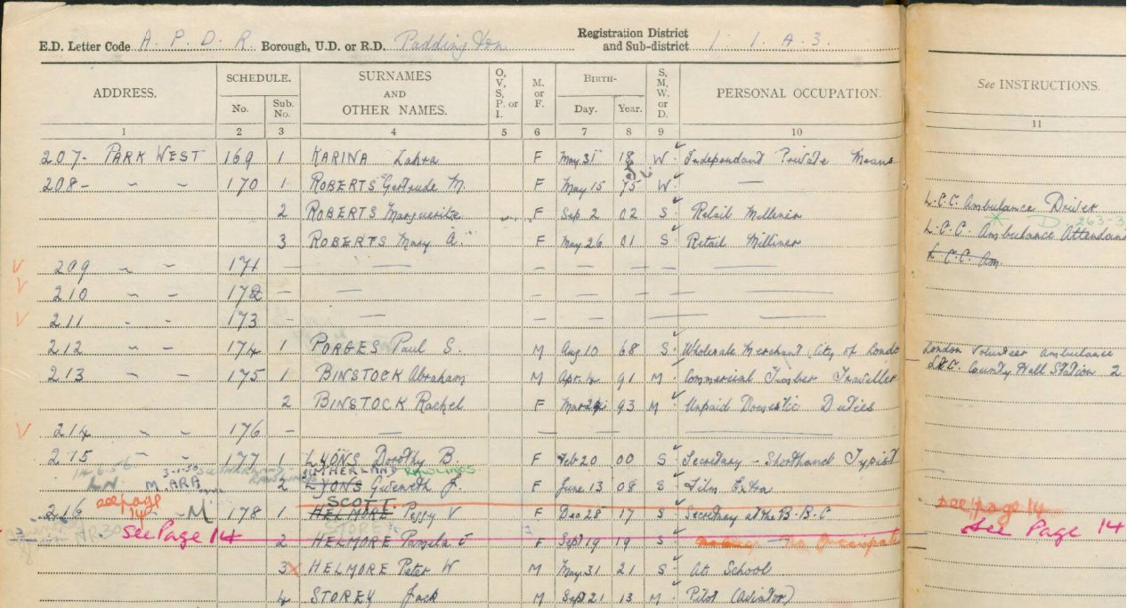 Margaret Joyce Trieb under Zahra Karina (her stage name), widow, born 31st May 1909, living at 207 Park West, Marble Arch, Paddington as Zahra (spelt Lahra in 'Find my Past') Karina, a widow on independent private means, in lodgings on her own.