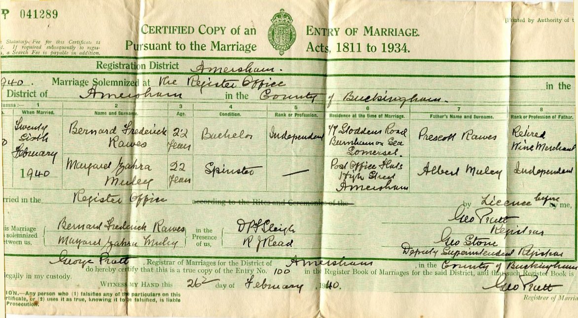 My mother was apparently living as Margaret Zahra Muley, at Post Office Flats, High Street, Amersham, was this actually where she was living? She was aged 22 and single - both not true. Her father was Albert Muley instead of Sydney Albert Mulvey. The marriage was by licence which suggests short notice. From now on she was Zahra Margaret (Marguerite in one document) Rawes née Muley (note the subtle change in surname).