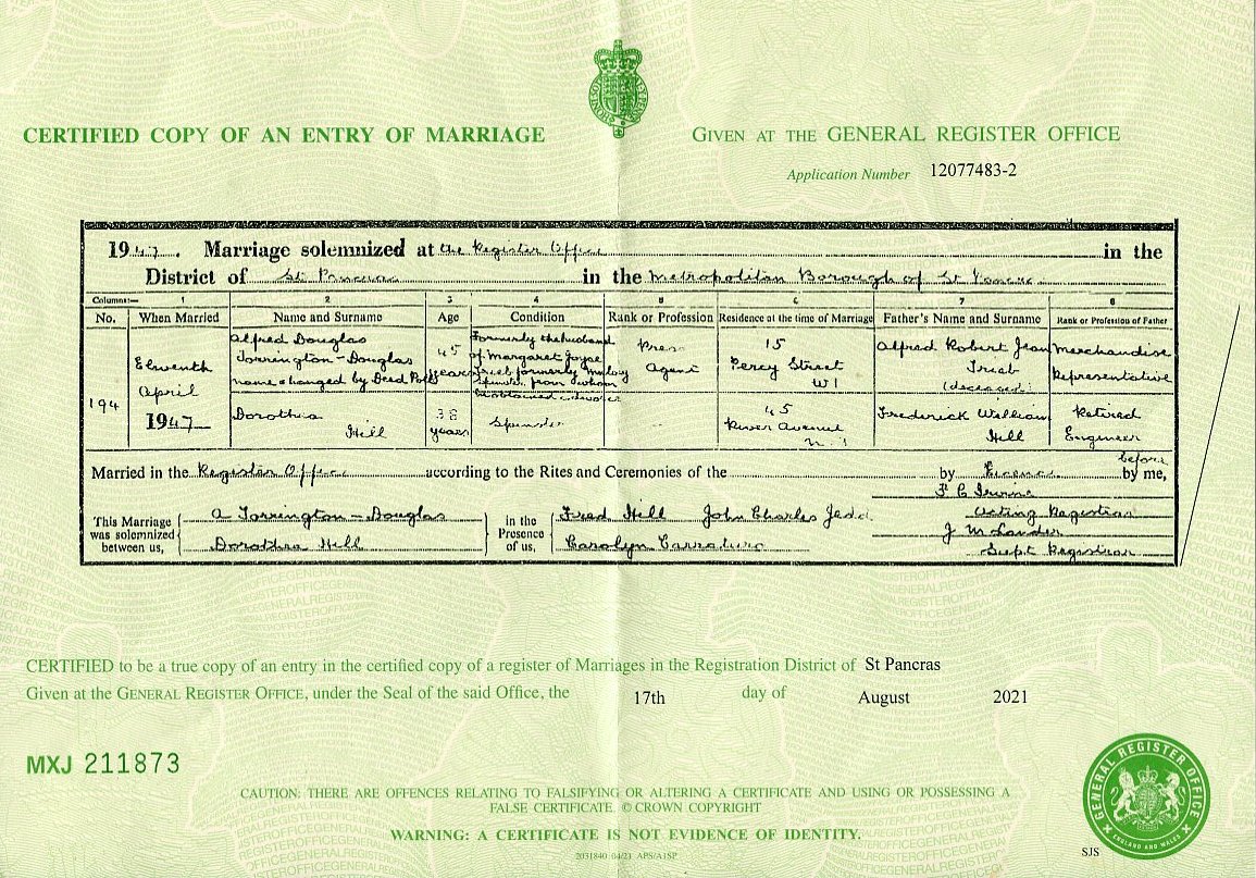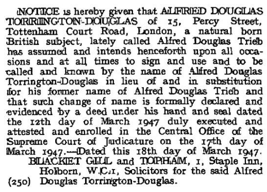 Either Douglas Trieb/Torrington Douglas had a poor moral upbringing or his action was the result of drink or the separation which he may have taken badly. In 1947 he finally changed his name by deed poll and three months later married Dorothea Hill. Note what is written on his marriage certificate: "Formerly the husband of Margaret Joyce Trieb formerly Mulvey spinster from whom he obtained a divorce", which does imply divorce proceedings had taken place. Douglas died on 23rd February 1986, 23 Lodge Drive, Palmers Green, London.
