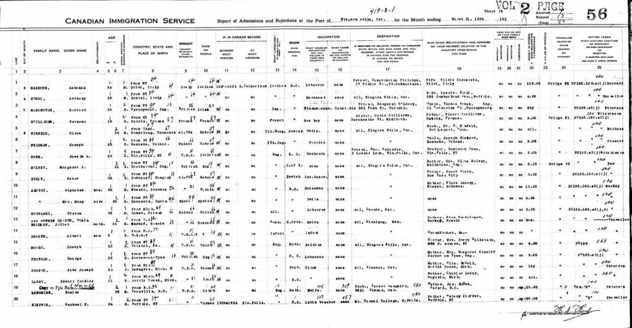 A document confirmed her story - as on 6th March 1931 she entered Ontario, Canada from New York. The details she gave were: Margaret J Mulvey; born Eastbourne, England; C of E, wished to visit Niagara Falls; Mother Mrs Olive Mulvey, Maidstone, England.