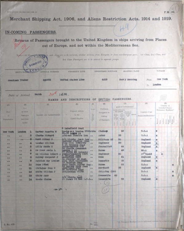 She sailed on the American Trader from New York and arrived at London on 24th March 1931; her proposed address was 4 Holland Road, Maidstone, presumably this was the address of her mother.