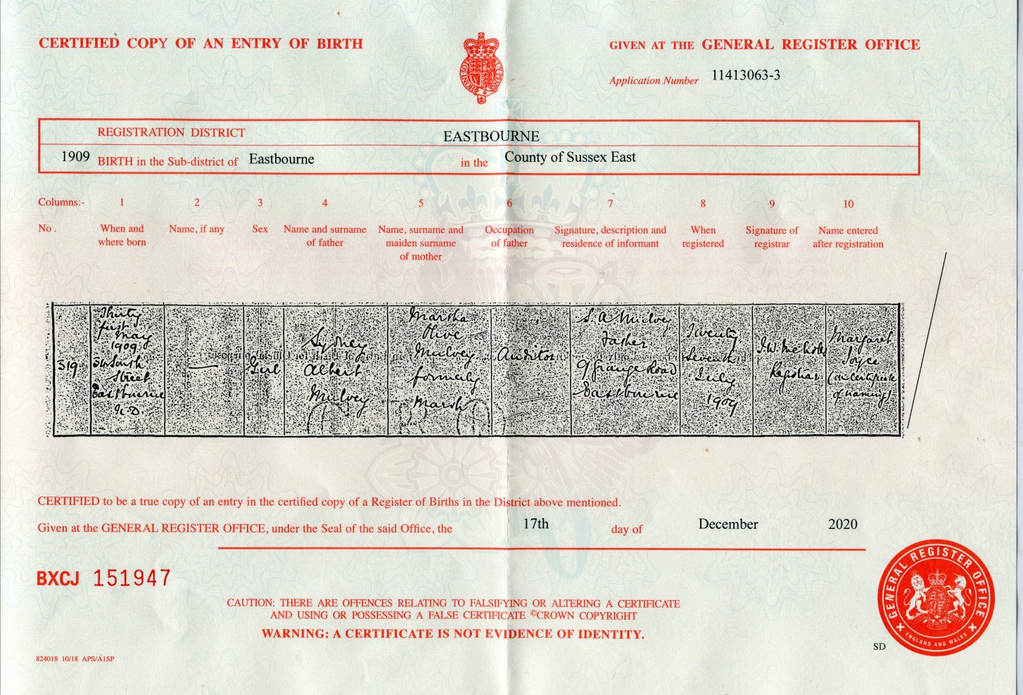 34 South Street, Eastbourne and Margaret Joyce Mulvey's birth certificate.