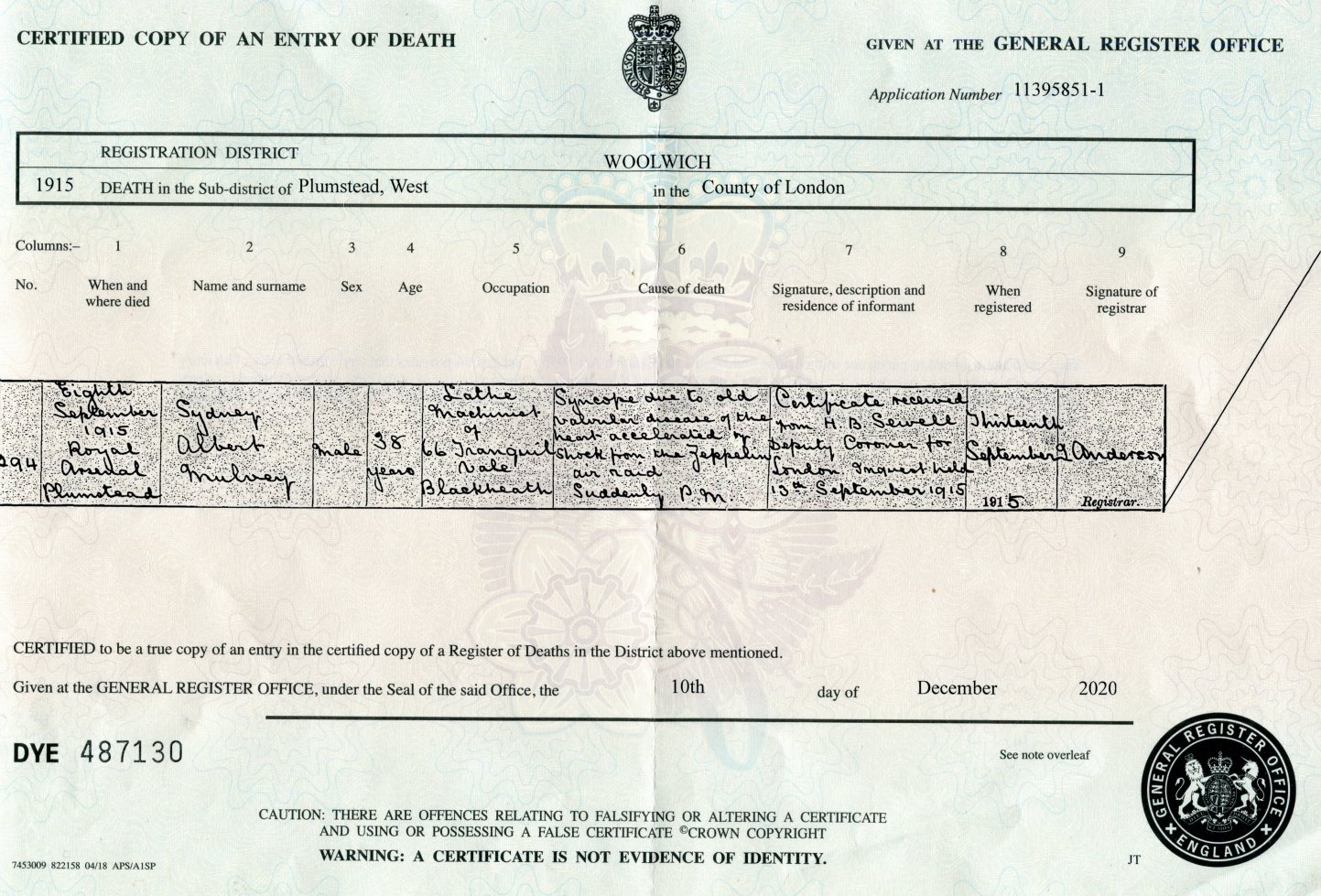 Margaret's father tragically died suddenly of a heart attack on 8th September 1915, aged 38 at the Royal Arsenal in Plumstead. His address was listed as 66 Tranquil Vale, Blackheath. This is partially corroborated by my mother who said that her father had died suddenly in a street from a heart attack when she was about eight. There is no indication that his family was living with him and the informant on his death certificate was the Coroner. His occupation as 'Lathe Machinist' might be related to wartime service.