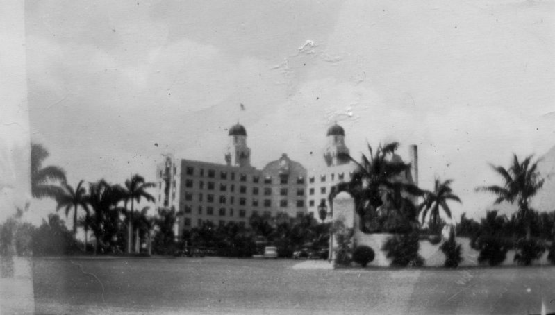 The photograph on the right was taken when she was about seventeen in Miami Beach in 1936. The scene was possibly taken in the grounds of the Nautilus Hotel where she was staying. A little girl standing by her side was apparently a Duchess. The Nautilus was a grand hotel built in 1924 by Carl Fisher. It was demolished in 1968 to make way for a hospital.