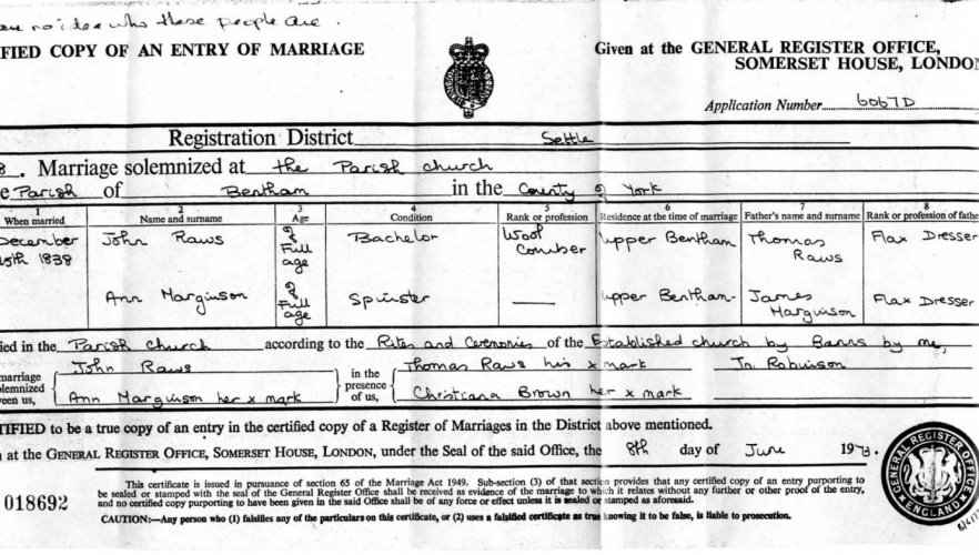 | Marriage | 1852 | Margaret Rawes & Robert Brown, Clapham, Yorkshire | n/r | C00107 |
