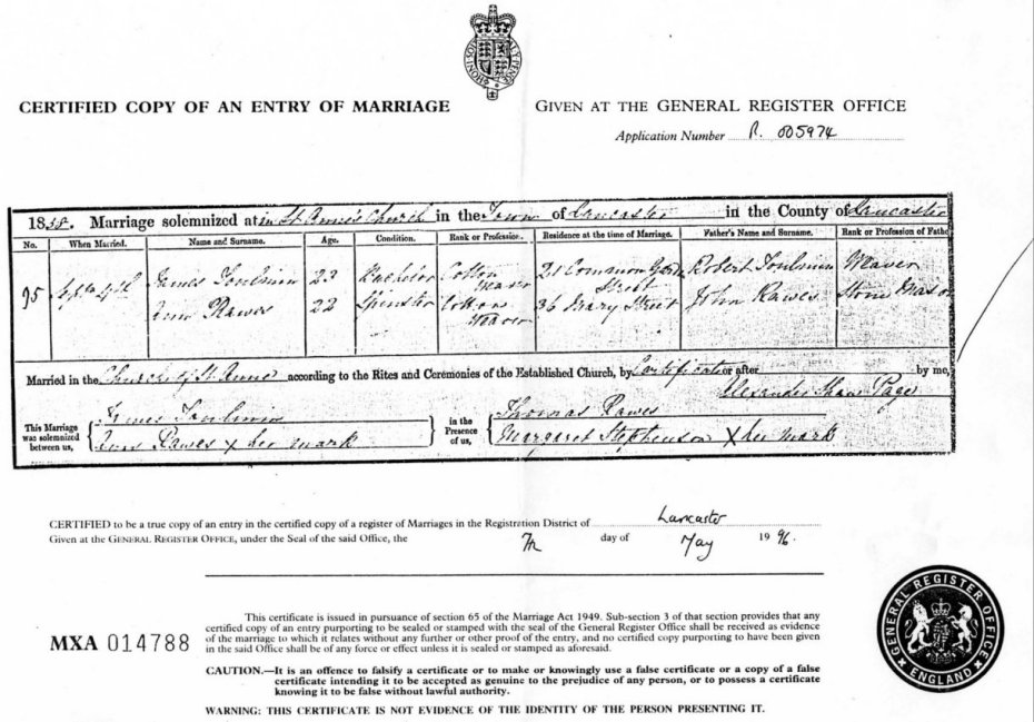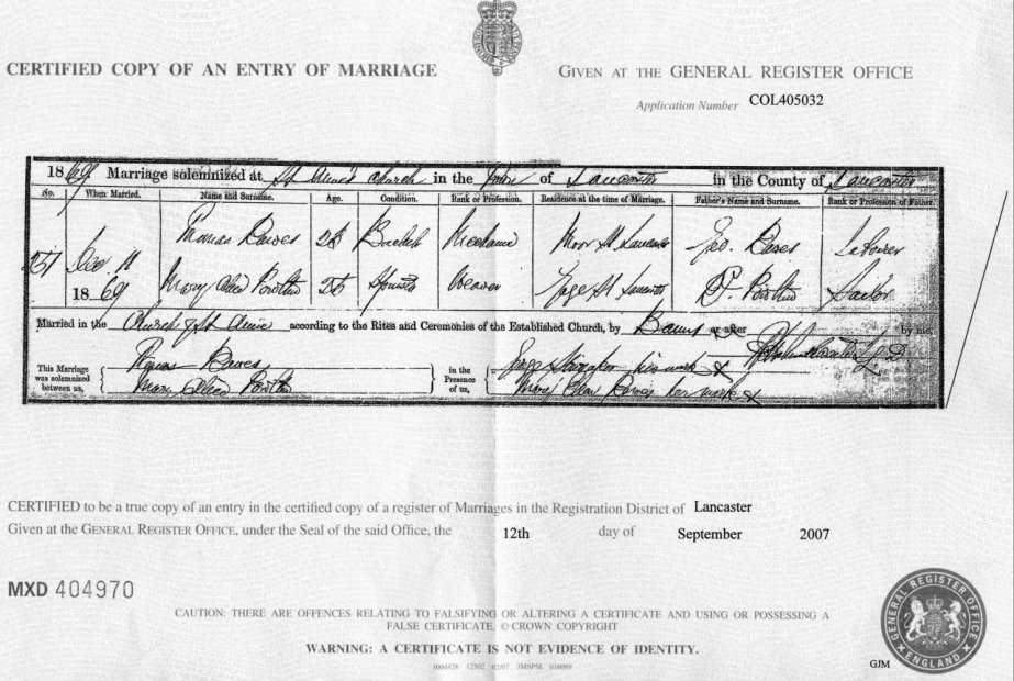 | Marriage | 1869 | Thomas Rawes & Mary Alice Poulton, Lancaster | n/r | C00045 |