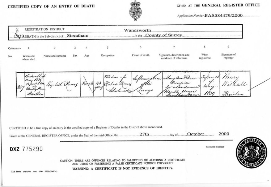 | Death | 1839 | Elizabeth Rawes, Wandsworth, Surrey | Morris | C00003 |