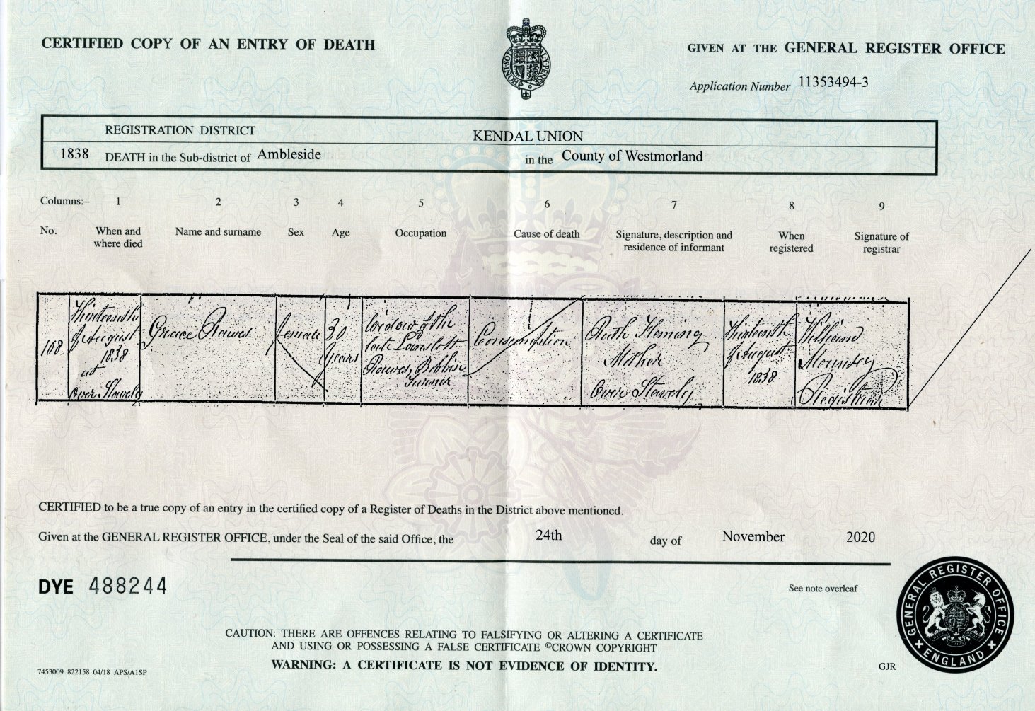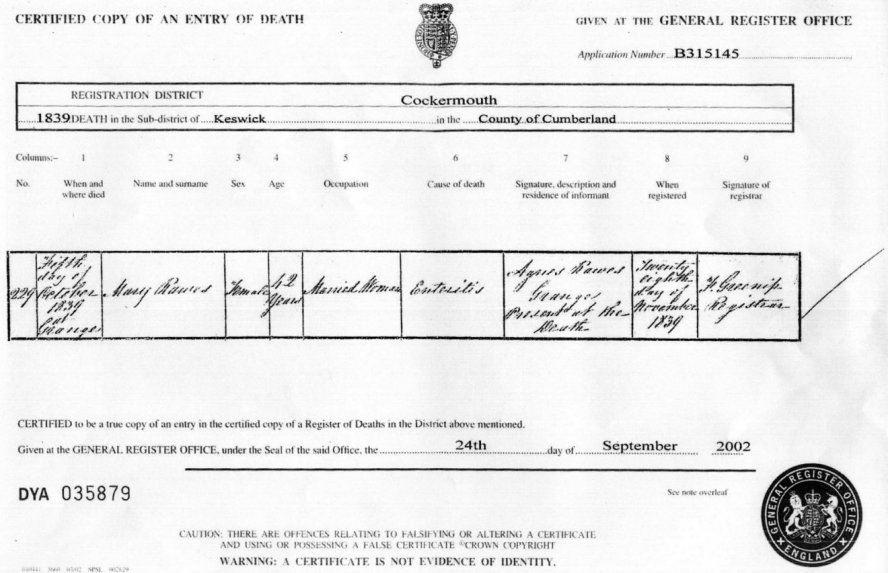| Death | 1838 | Grace Rawes, Over Stavely, Westmorland | Fleming | C00117 |