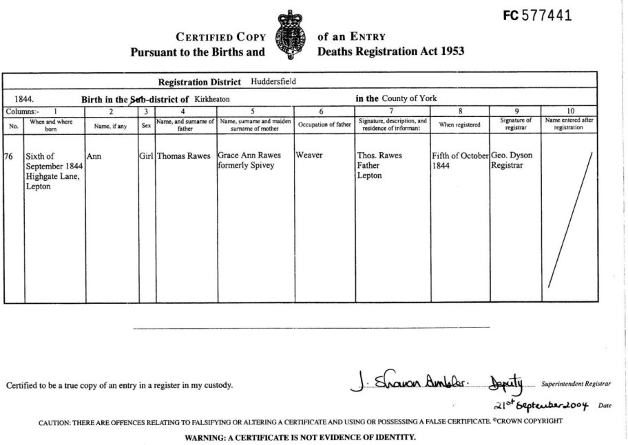 | Birth | 1844 | Ann Rawes, Kirkheaton, YKS | Spivey | C00006 |