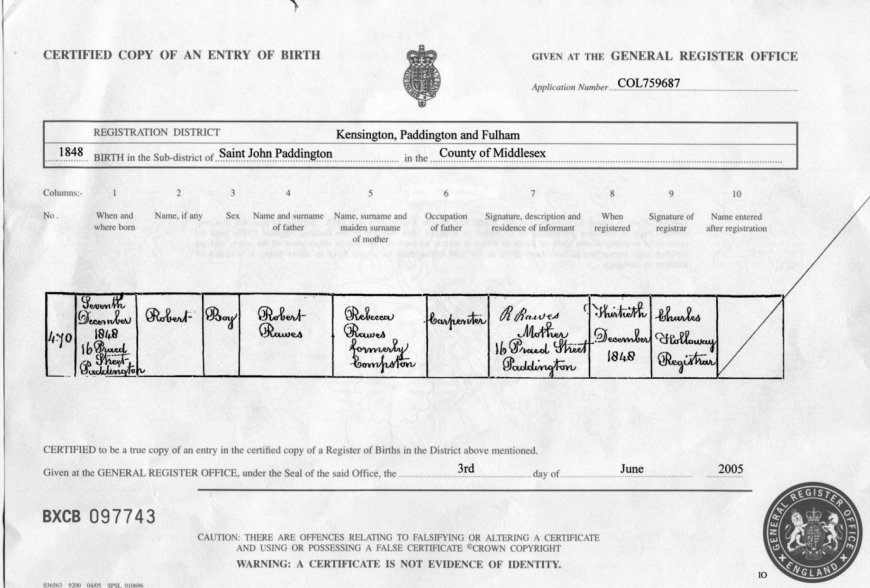 | Birth | 1848 | Robert Rawes, Paddington, MDX | Plumgarths | C00011 |