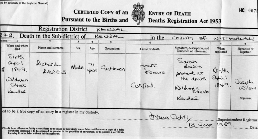 | Death | 1849 | Richard Rawes, Kendal, Westmorland | Augustus | C00013 |
