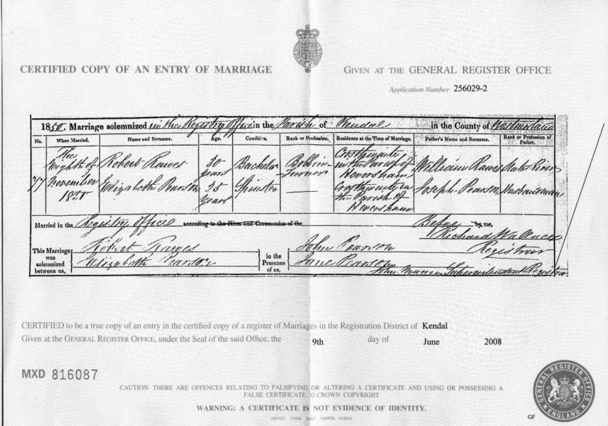 | Marriage | 1850 | Robert Rawes & Elizabeth Pearson, Kendal, Westmorland | Seatoller | C00014 |