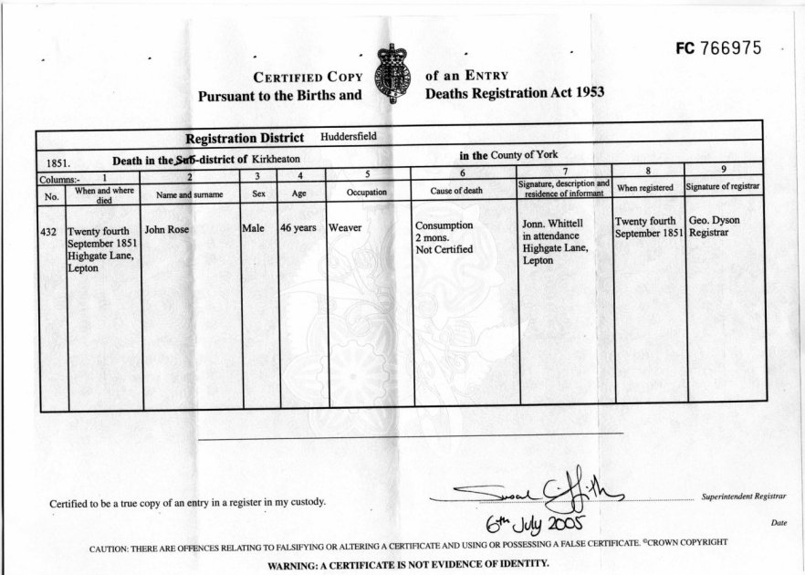 | Death | 1851 | John Rose, Kirkheaton, YKS | Bird | C00015 |