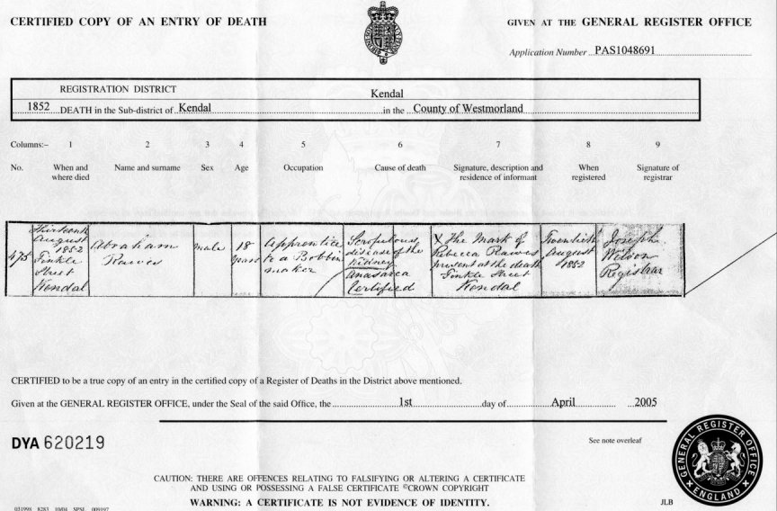 | Death | 1852 | Abraham Rawes, Kendal, Westmorland | Fishmonger | C00016 |