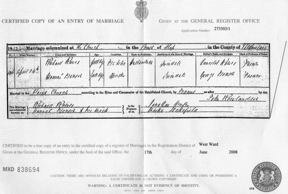 | Marriage | 1852 | Richard Rawes & Hannah Mausel, Shap, Westmorland | Dick Rawes | C00017 |