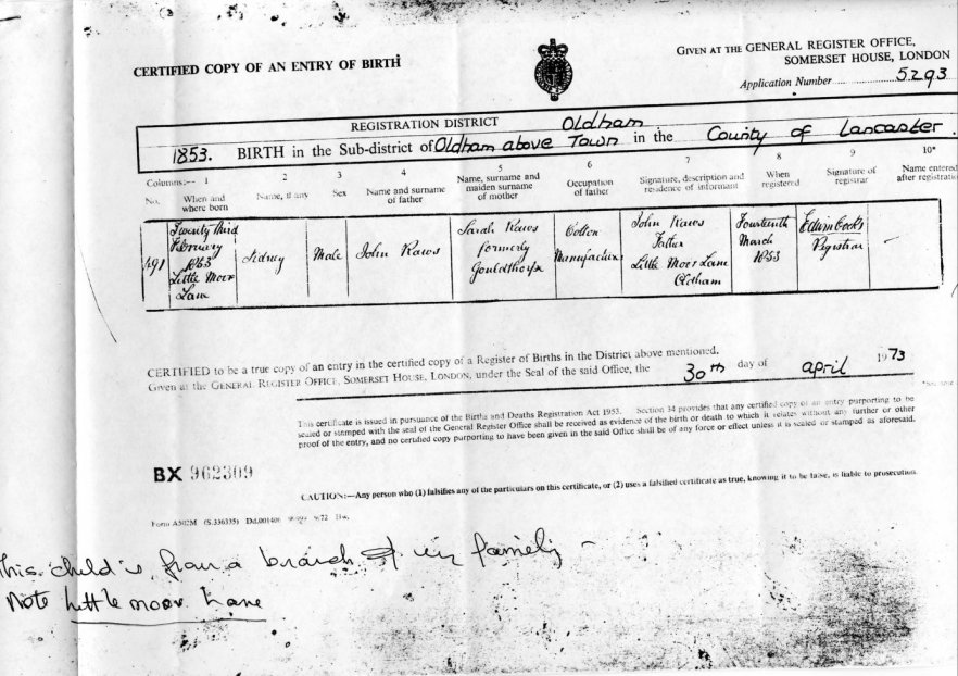 | Birth | 1853 | Sidney Rawes, Oldham, Lancs | Shoemaker | C00018 |
