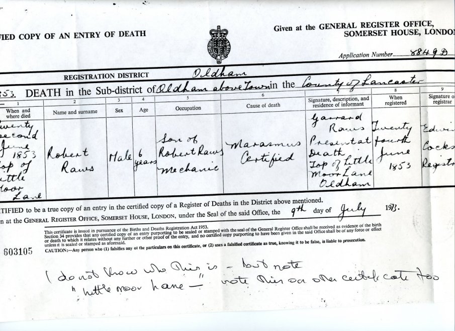 | Death | 1853 | Robert Raws, Oldham, Lancs | Shoemaker | C00019 |