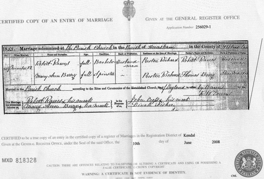| Marriage | 1853 | Robert Rawes & Mary Ann Berry, Heversham, Westmorland | p/p | C00020 |