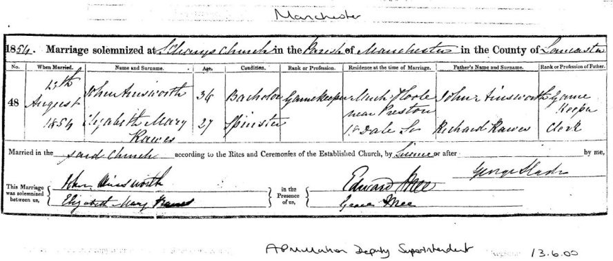 | Marriage | 1854 | Elizabeth Mary Rawes & John Ainsworth, St Mary's Manchester | Morris | C00021 |