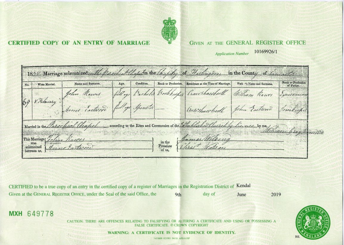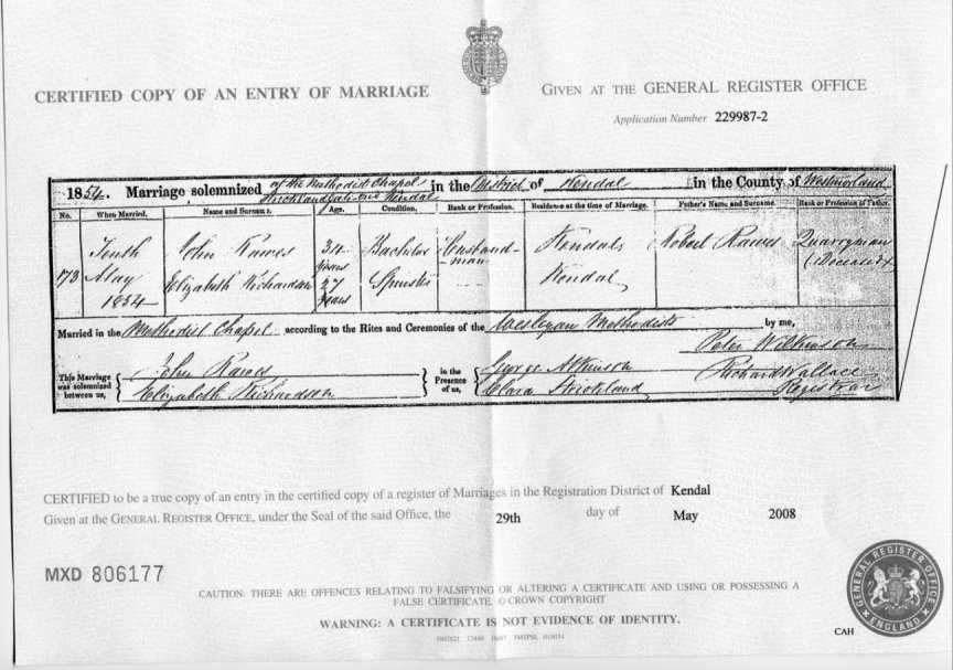 | Marriage | 1839 | Rebekah Rawes, Kendal, Westmorland | Kendal | C00093 |