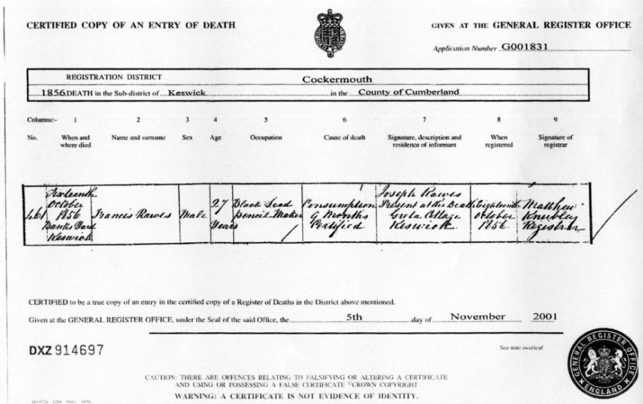 | Death | 1856 | Francis Rawes, Keswick, Cumberland | Jamaica | C00024 |
