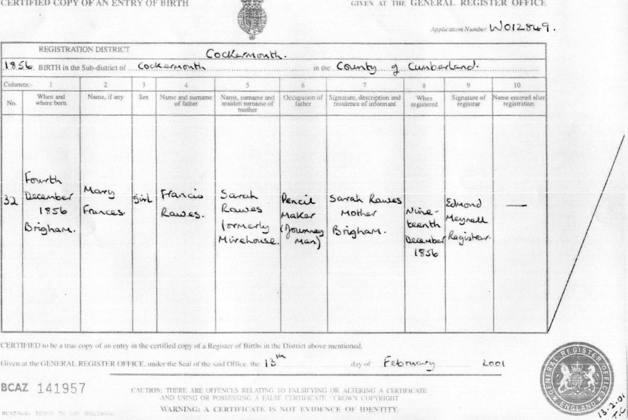 | Birth | 1856 | Mary Frances Rawes, Brigham, Cumberland | Jamaica | C00025 |