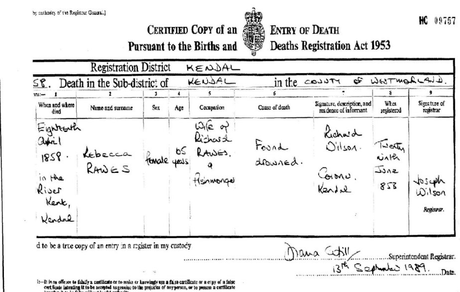 | Death | 1858 | Rebecca Rawes, Kendal, Westmorland | Fishmonger | C00026 |