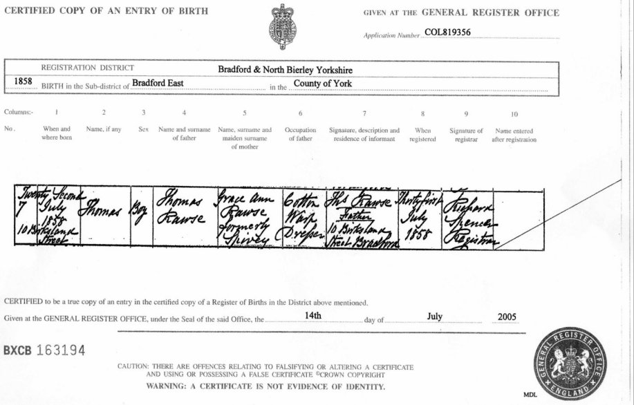 | Birth | 1858 | Thomas Rawse, Bradford, YKS | Spivey | C00027 |
