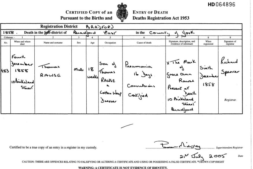 | Death | 1858 | Thomas Rawse, Bradford, YKS | Spivey | C00028 |
