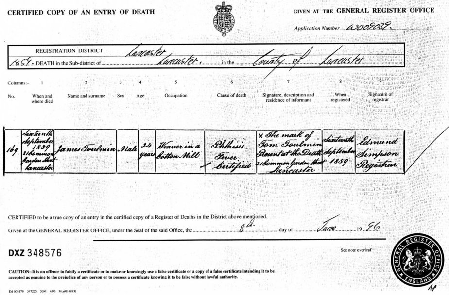 | Death | 1859 | James Toulmin, Lancaster, Lancs | Toulmin | C00030 |