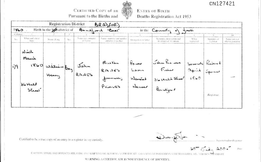 | Birth | 1860 | William Henry Rawes, Bradford, YKS | Spivey | C00031 |