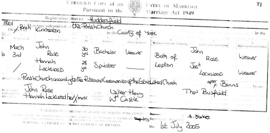 | Marriage | 1861 | John Rose & Hannah Lockwood, Huddersfield, YKS | Bird | C00033 |