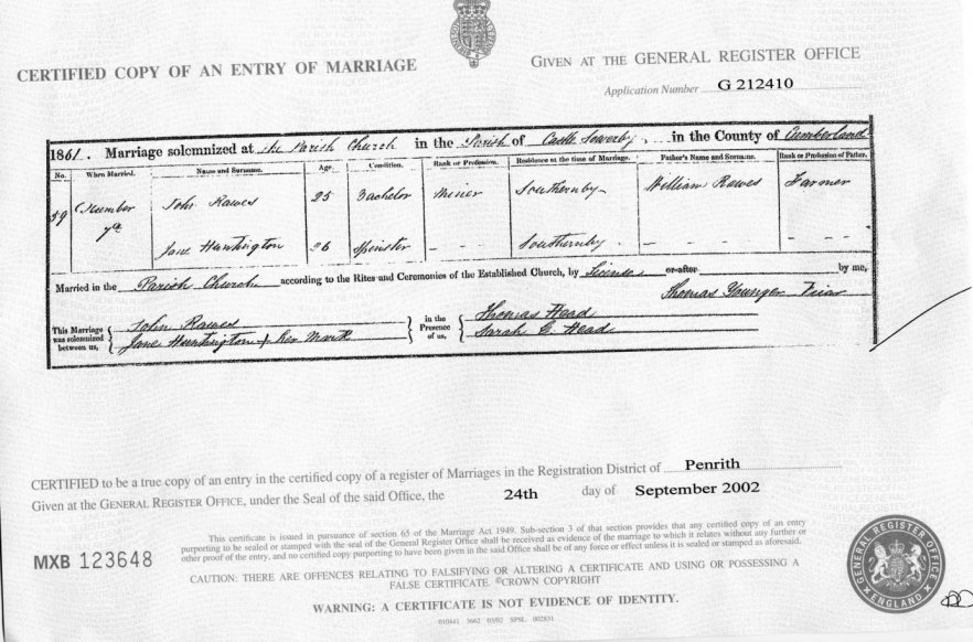 | Marriage | 1861 | John Rawes & Jane Huntington, Castle Sowerby, Cumberland | Anthony | C00034 |