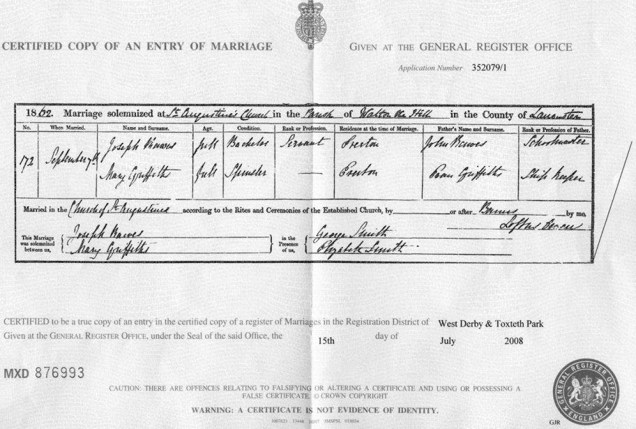 | Marriage | 1862 | Joseph Rawes & Mary Griffiths, West Derby, Lancs | Jamaica | C00036 |
