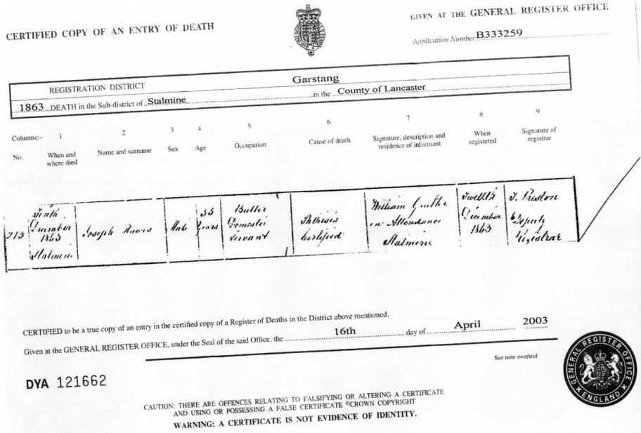 | Death | 1846 | Gerrard Raws, Haslingden, Lancs | Shoemaker | C00008 |