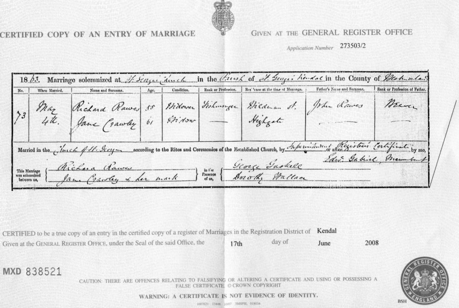 | Marriage | 1863 | Richard Rawes & Jane Crawley, Kendal | Fishmonger | C00038 |