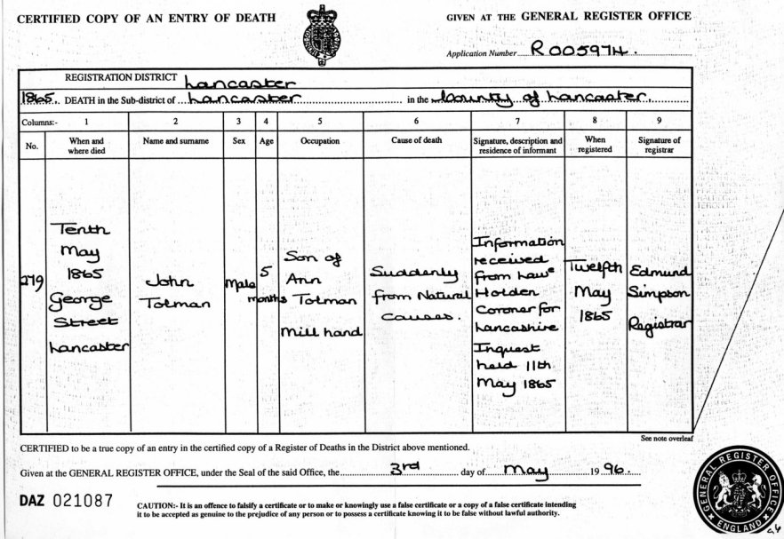 | Death | 1865 | John Toulmin, Lancaster | Toulmin | C00042 |