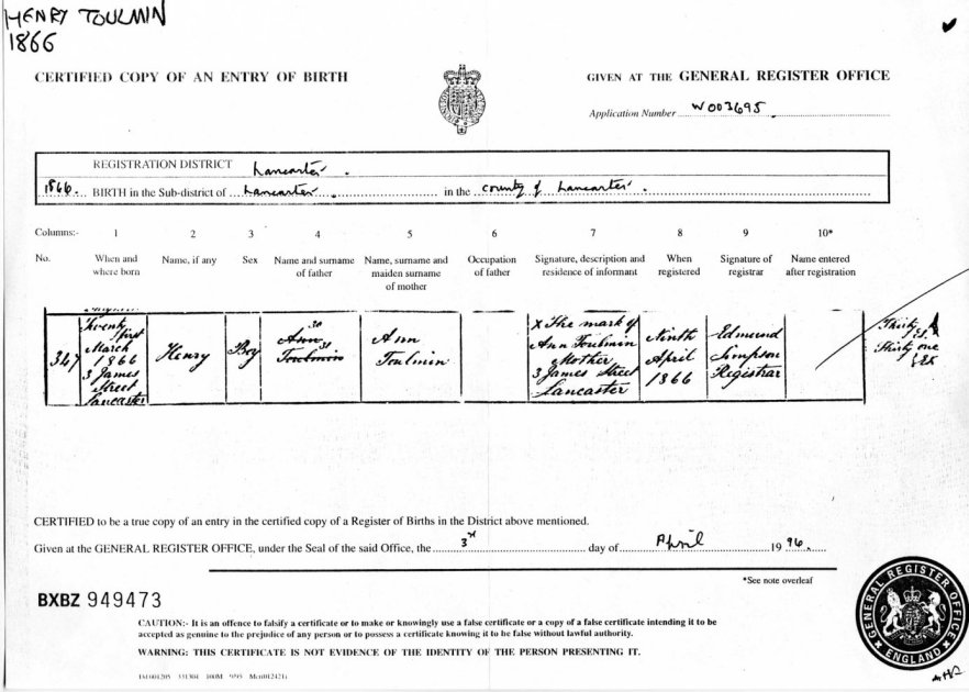| Birth | 1866 | Henry Toulmin, Lancaster | Toulmin | C00043 |