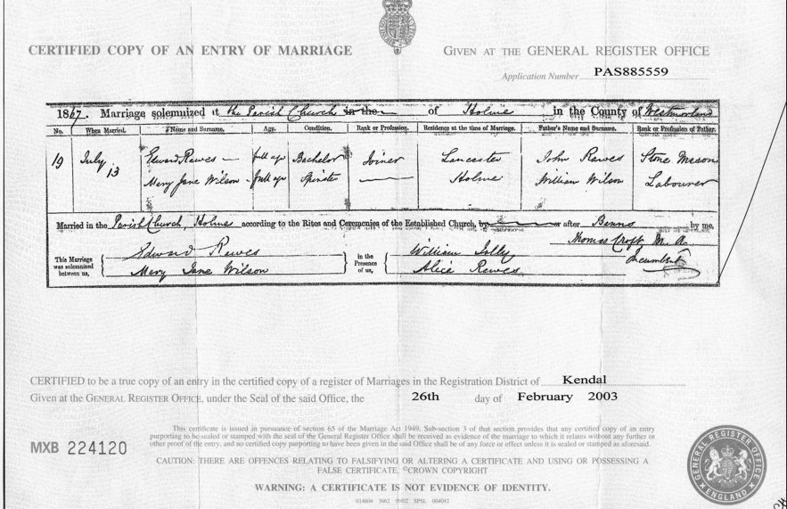| Marriage | 1867 | Edward Rawes & Mary Jane Wilson, Holmes, Westmorland | Varey | C00044 |